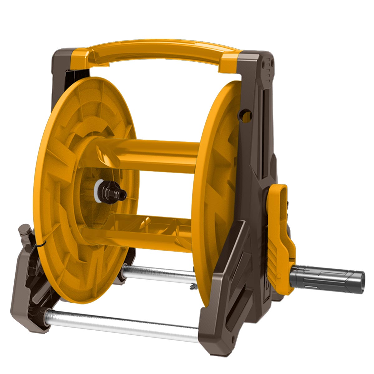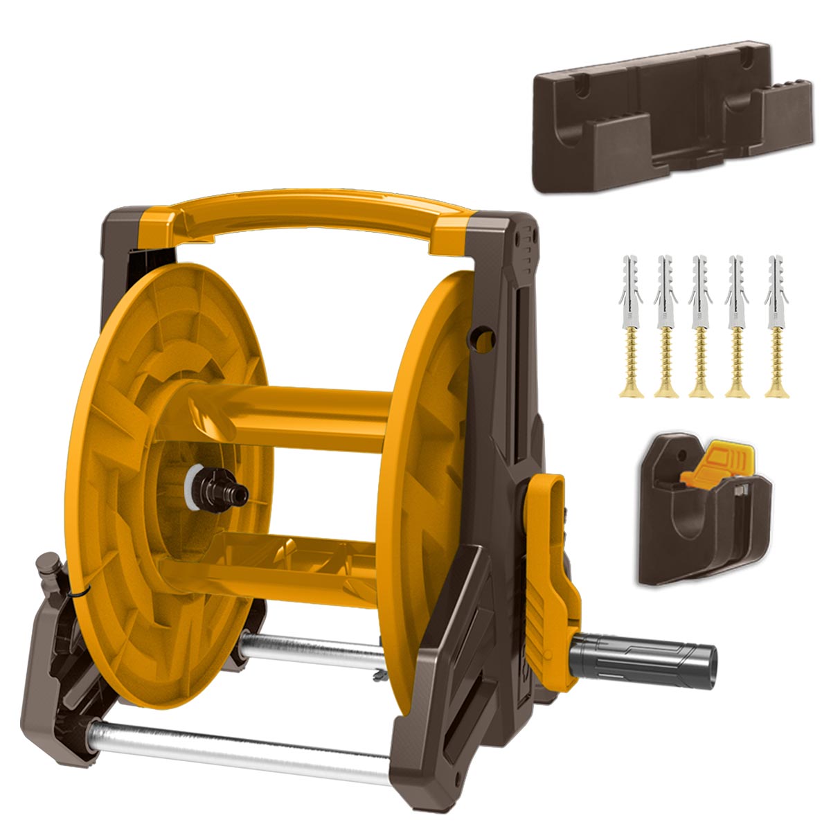 Λεπτομέρειες προϊόντος Δυνατότητα τοποθέτησης λάστιχου: Ø 1/2″ έως 40 μέτρα, Ø 5/8″ έως 30 μέτρα, Ø 3/4″ έως 25 μέτρα. Αναδιπλούμενη λαβή για πιο άνετο και γρήγορο μάζεμα. Στήριγμα σωλήνα αλουμινίου, μπορεί να κρεμαστεί στον τοίχο. Η τριγωνική δομή του Καρουλιού Λάστιχου εγγυάται την εξαιρετικά σταθερή στήριξη. Χάρη στον σπαστό σύνδεσμο λάστιχου μέσα στο καρούλι, αποτρέπεται η στρέβλωση του λάστιχου και παρέχεται προστασία από τη φθορά. Με την ανέμη ποτίσματος γίνεται εξοικονόμηση χώρου και το λάστιχο οδηγείται ομοιόμορφα κατά τη χρήση του. Το πότισμα γίνεται ιδιαίτερα εύκολο και βολικό, ενώ το λάστιχο διατηρείται καλύτερα χωρίς τσακίσματα.