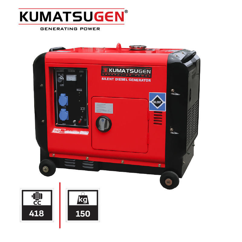 Τριφασική γεννήτρια κλειστού τύπου KUMATSUGENμε κινητήρα πετρελαίου. Η κατασκευή κλειστού τύπου βοηθά στη μείωση του θορύβου κατά τη λειτουργία της. Είναι εξοπλισμένη με μίζα για πιο εύκολη και γρήγορη εκκίνηση.
